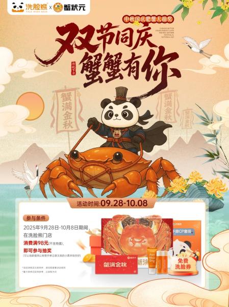 中秋与国庆双节叠加的消费旺季,各行业品牌纷纷推出特色活动抢占市场。面部清洁品牌洗脸熊近期开展“双节同庆,蟹蟹有你”活动,消费者满足指定消费条件即可获得抽中大闸蟹的机会。这场将面部清洁服务与传统节日饮食文化结合的营销活动,既折射出消费市场细分领域的创新趋势,也展现了新消费品牌对节日经济场景的深度挖掘。